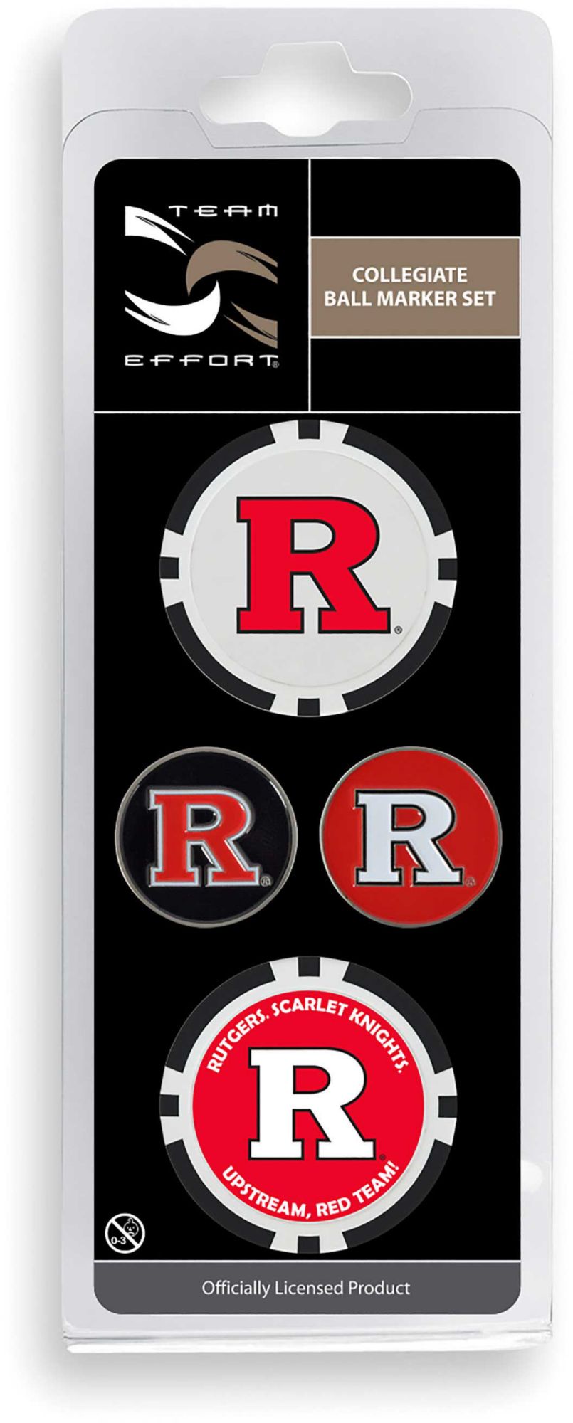 Remind your course mates of your pride in the Scarlet Knights as you prepare for your putt with the Team Effort Rutgers Scarlet Knights Ball Marker Set. Two 40mm poker chip style ball markers feature multiple team trademarks and provide an eye-catching take on alignment. Two 25mm iron stamped ball markers feature a full-color team trademark and are suitable for use with most magnetic hat clips for convenience. Leave no doubt about your Scarlet Knights spirit with this unique ball marker set.